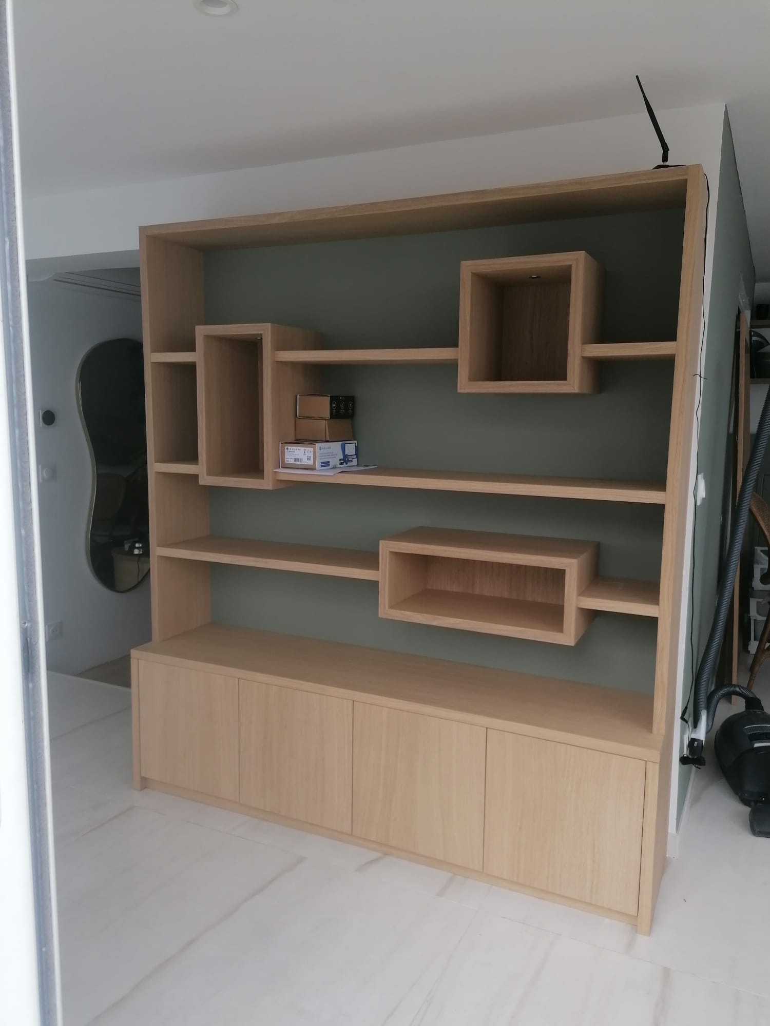 Meuble de rangement en mélaminé sur-mesure, associant portes pleines et étagères ouvertes, pensé pour un usage quotidien fluide et structuré. Une solution à la fois pratique et esthétique, idéale pour rythmer un espace tout en offrant de multiples fonctions.